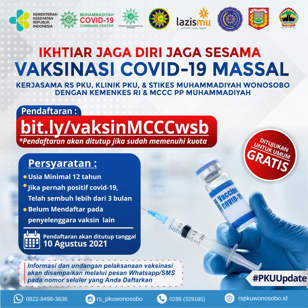 Vaksinasi Covid-19 Massal Kerjasama RS PKU, Klinik PKU, & STIKesMu Wonosobo dengan Kemenkes RI & MCCC PP Muhammadiyah.